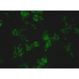 Porta tapizado de células infectadas con Rickettsia rickettsii para Inmunofluorescencia Indirecta. Permite la detección de IgG. Patrón de fluorescencia: Estructuras cocobacillas fluoresecentes entre glóbulos rojos ovinos, algunos agrupados.
